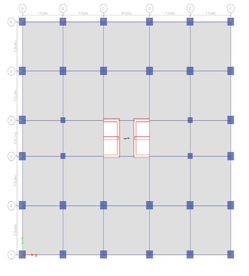 A symmetrical building of plan 38.5m X 35.5m located with location in zone V, India is considered. Four bays of length 7.5m& one bays of length 8.5m along X -direction and Four bays of length 7.5m& one bays of length 5.5m along Y -direction are provided. Shear Wall is provided at the center core of building model.