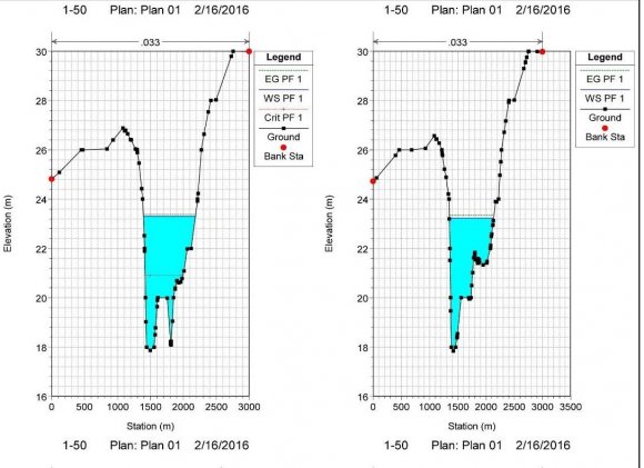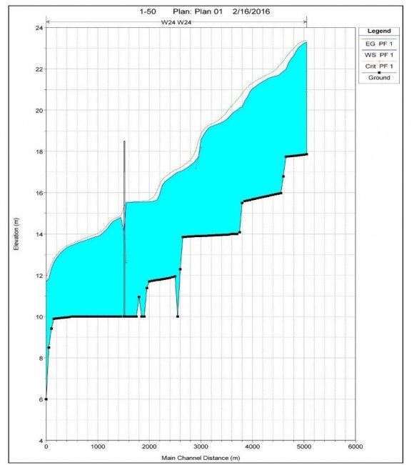 The bridges in the case study are used at the intersection of the valleys that are characterized by high inflows and a clear known Cross-section with the suggested pathways. Likewise, the study of the bridges aims to determine their importance and ability to transmit and pass inflows from the Wadi Bayad basin, which intersecting with the Jizan-Abha Highway. Also, the purpose of hydraulic analysis and bridge design is to identify the highest water surface level during the maximum flood runoff causing by the bridge, Figures (22), (23). As well as determine the water velocity before and after the bridge to dedicate the proper and required maintenance. Furthermore, its importance to determine the resulted erosion depth caused by the inflow at the pillars and supported walls. The hydraulic study of the bridges is based on the rainstorm repeated every 100 years.