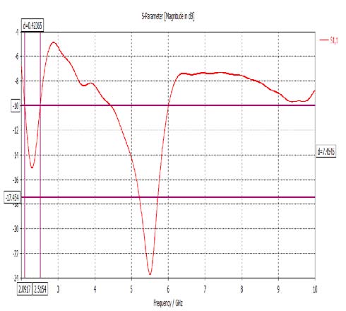 Ratio of intensity in a given direction to the radiation power that would be achieved from it if power is radiated by the antenna isotropically. The simulation outcomes of the gain are shown below and the gain obtained is 1.13dB at 2.45 GHz and 3.685dB at 5.8GHz. The proposed antenna resonates from 2.0917 GHz -2.5154 GHz which is covering the bandwidth range 2.4GHz-2.5GHz with center frequency 2.45 GHz and 4.4327 GHz -6.008GHz covering the bandwidth range 5.75GHz-5.875GHz with center frequency 5.8 GHz which is applicable for application in ISM as shown in the above figures. The S11 parameters of fabricated antenna are shown above which are tested in vector network analyzer at resonant frequency of 2.41 and 5.89GHz. The VSWR ratio of 2.41GHz and 5.89GHz frequencies is 1.54 and 1.27 respectively. Smith chart speaks that how the receiving wire impedance differs with recurrence. The above table is about the examination of recreated result and the testing result. The deliberate and mimicked return loss qualities of the preferred antenna are appeared in Fig. 4. These are -16.75dB and in case of experimental result it is -34.6dB at 2.45GHz, at 5.8GHz expected return loss is -23.98dB and in case of experimental result it is -38.1dB. The bandwidth got amid the reenactment of an antenna in CST programming first bandwidth range got is 2.03-2.49GHz and second bandwidth range got is 4.45-6GHz which is covering the frequency range of ISM. While manufactured antenna gives recurrence of 2.41GHz and 5.89GHz. Simulation process is giving VSWR range in between 1 and 2 at dual frequency and experimental result is giving VSWR of 1.54 at 2.45GHz and 1.27 at 5.8GHz. By contrasting the aftereffects of recreation process and exploratory process we can infer that exploratory outcomes are far superior to simulation result.