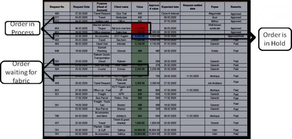 There numerous datas in drive like internal request, purchase request, fabric booking, sample request, order sheet request etc. There will be more orders to look simultaneously but some have prior attention due to high value order or orders that received advanced payment etc.. In that case all these orders in a sheet will be highlighted in different way to indicates the importance and status of each orders shown in Fig 5 This reduces the confusion of getting jammed of finishing certain works. This goes by a flow and every order gets good time management and most probably the delay in each process will be eliminated.